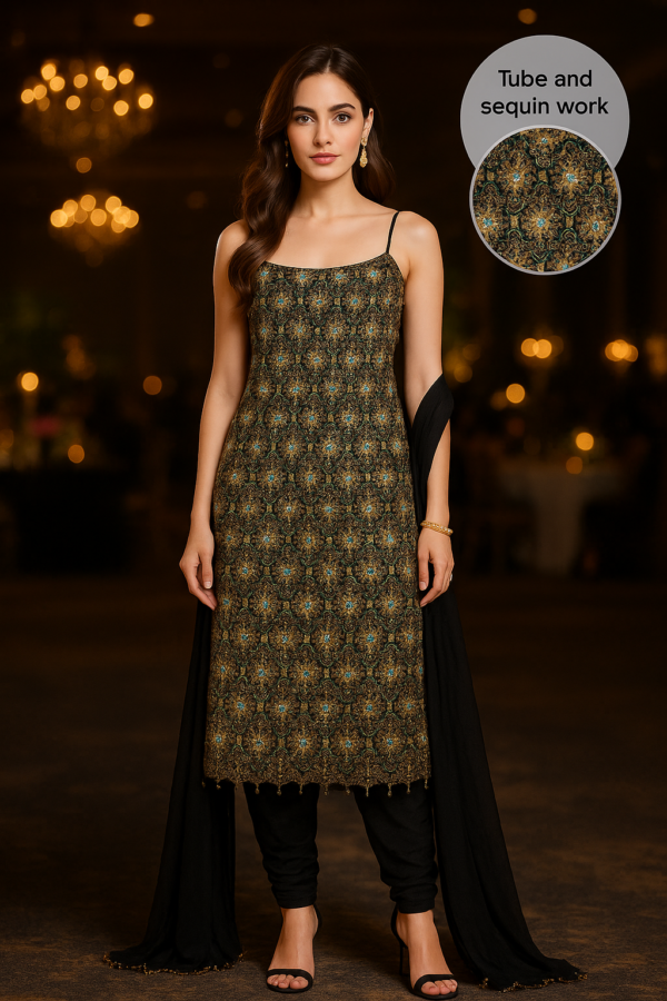 Elegant black georgette suit featuring an all-over copper-toned design with intricate tube and