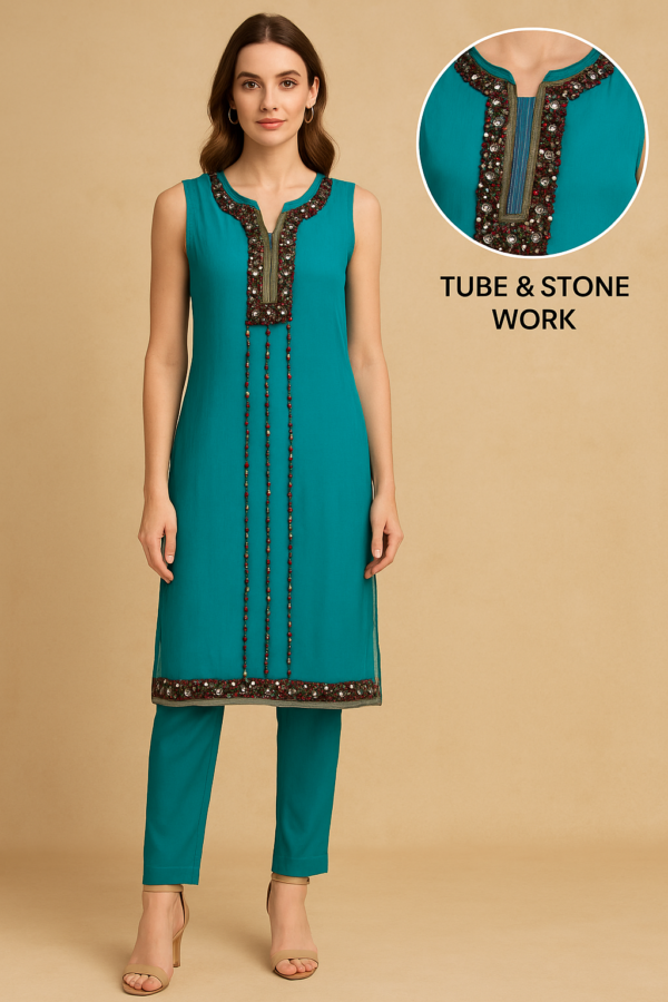 Teal georgette sleeveless kurti featuring a sweetheart neckline and front panel adorned with tube